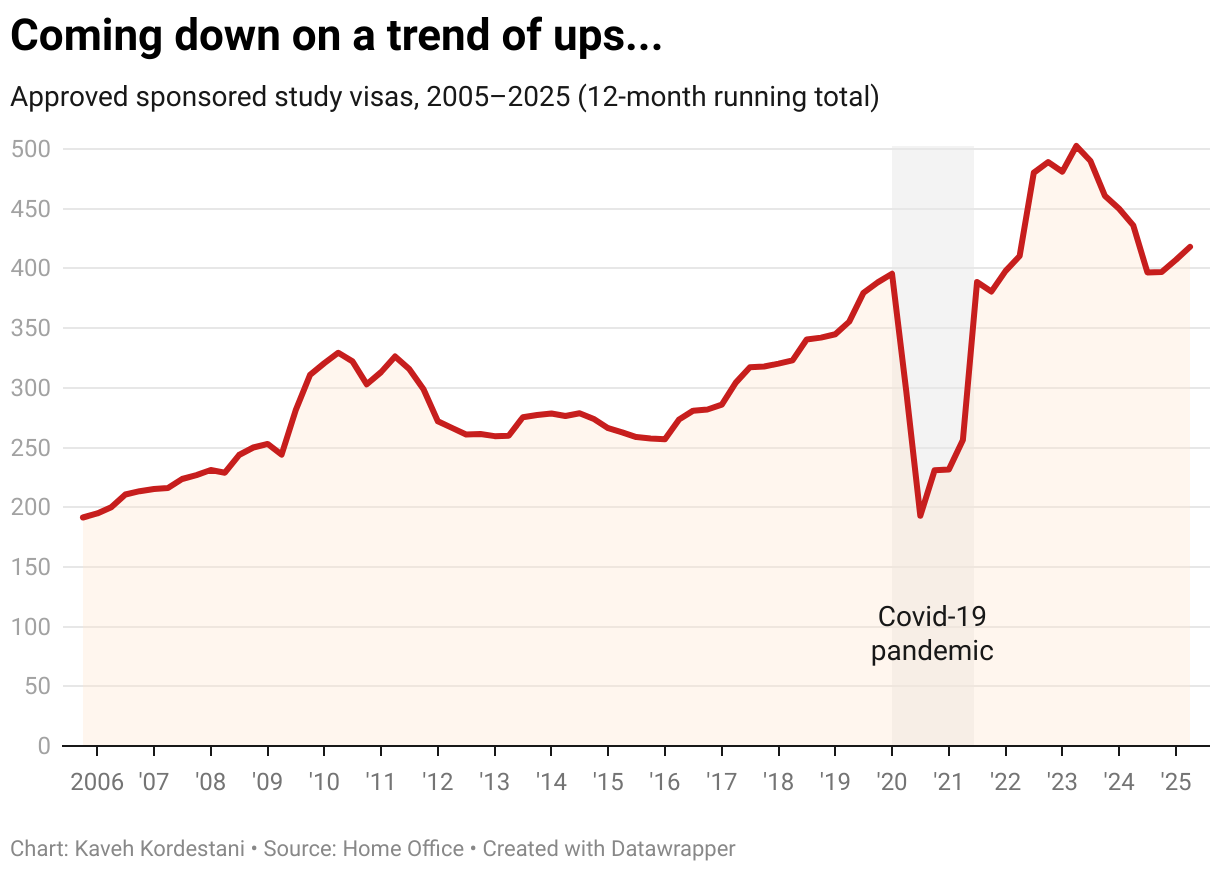 The pause comes amidst a difficult time for the attractiveness of British international study programmes. Figures published in October showed a small resurgence in sponsored study visas but still a 34% fall from its peak in 2023. Numbers for US students have remained almost exactly the same for over a decade.