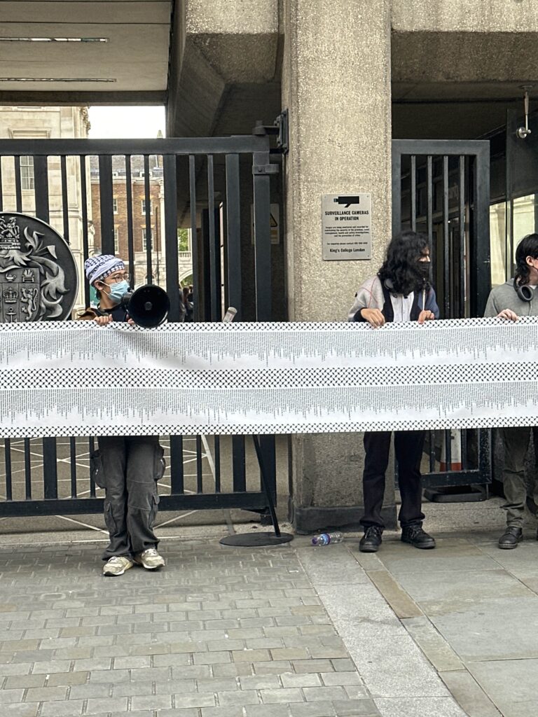 During the action, members of KCL Students for Justice for Palestine (KCL SJP) held a banner listing the names and ages of children killed by the Israeli military in Gaza.