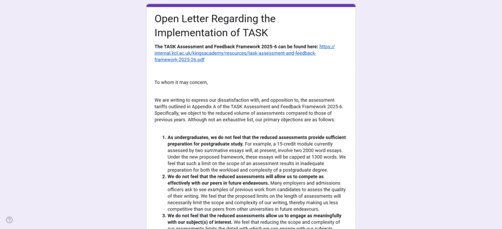 It is these ‘reduced assessments’ that have been particularly controversial. This week, an open letter has been launched by King’s students calling for “further consideration” to be paid to planned changes: